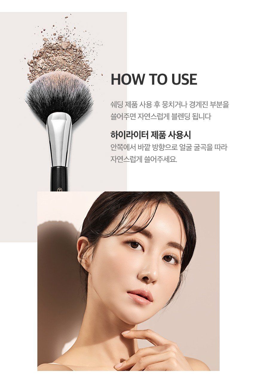 Khi sử dụng với sản phẩm highlight, tán nhẹ từ trong ra ngoài dọc theo đường cong gương mặt, tạo hiệu ứng bắt sáng tự nhiên, thanh thoát.