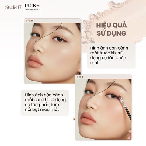 Di chuyển cọ dọc theo đường mí mắt trên hoặc vùng tam giác ngoài, tán nhẹ nhiều lần để tạo hiệu ứng khói mềm mại và chiều sâu tự nhiên. Sau đó, dùng đầu cọ để đi viền dưới mắt, giúp hoàn thiện ánh nhìn sắc sảo và cuốn hút.