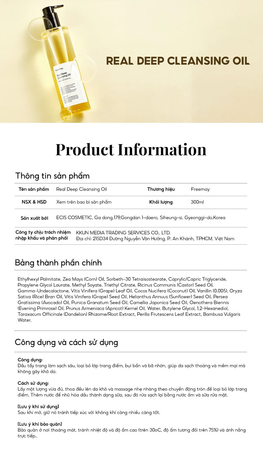 Làm sạch chính là bước quan trọng nhất để duy trì một làn da khỏe mạnh, mịn màng và tràn đầy sức sống. Freemay Real Deep Cleansing Oil 330ML được phát triển dựa trên triết lý “làm sạch sâu, dưỡng mềm mịn”, mang đến trải nghiệm tẩy trang vượt trội, loại bỏ hoàn toàn bụi bẩn, bã nhờn và lớp trang điểm dày, đồng thời nuôi dưỡng và tái tạo làn da ngay trong từng bước làm sạch.